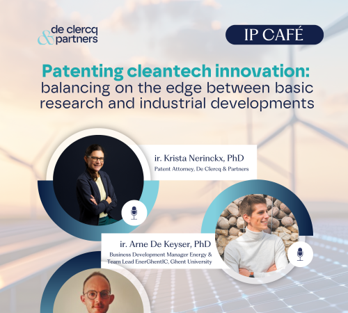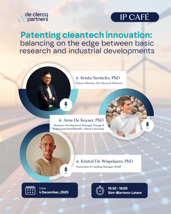 Discover how to turn sustainable ideas into protected, impactful innovations, using insights from our experts: Krista Nerinckx (European Patent Attorney at De Clercq & Partners), Arne De Keyser (Business Development Manager Energy & Team Lead EnerGhentIC at Ghent University), and Kristof De Wispelaere (Innovation & Funding Manager at BASF).